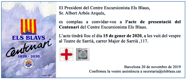 L’acte de presentació i inauguració de les festes del Centenari del Centre Excursionista Els Blaus, serà en un lloc emblemàtic per Sarrià i els Sarrianencs, El Teatre de Sarrià. Es preveu convidar a aquest acte a tots els socis, sòcies i simpatitzants amics d’Els Blaus. A totes les associacions de Sarrià, als centres excursionistes de Catalunya i autoritats.